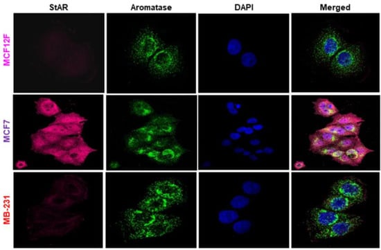 Cancerous hormone-dependent (MCF7) and hormone-independent (TNBC; MB-231), and non-cancerous (MCF12F) breast cells were seeded in 6-well plates (3 × 105 cells/well) containing coverslips (12 mm), 24 h prior to immunofluorescence staining [,]. Briefly, cells were washed with 0.1 M PBS and fixed with 4% paraformaldehyde for 15 min at RT, followed by quenching with 50 mM NH4Cl, and then permeabilized with 1% Triton X-100 for 10 min. Different cell types containing coverslips were blocked with 4% BSA for 30 min followed by 1 h incubation with StAR (1:200) and aromatase (1:300) Abs. After incubation, cells were washed with PBS, and incubated with Alexa flour 488 and 565 secondary Abs (both at 1:600; Thermo Fisher Scientific, Waltham, MA, USA) for 1 h at RT. Cells were then rinsed with PBS for 5 min and mounted with Pro-Long Gold antifade mounting solution with DAPI (Thermo Fisher Scientific), cured overnight at RT, and stored at −20 °C until immunofluorescence analysis. The images were captured using a laser scanning confocal microscope Nikon T-1E with a 60X objective and analyzed using NIS software [,].