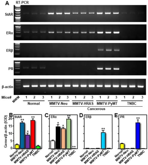 The hypothesis that hormone-sensitive BCs express aberrantly high expression of StAR, along with increased E2 accumulation, to promote tumorigenesis, was evaluated. Three different Tg mouse models of spontaneously occurring breast tumors utilized were: MMTV-Neu, MMTV-HRAS, and MMTV-PyMT, in addition to one TNBC mouse model and similar genetic background wild-type mice [,]. As determined by semi-quantitative RT-PCR, expression of StAR mRNA was evidently high in breast tumors induced by Neu, HRAS, and PyMT oncogenes, when compared with either TNBC or normal mouse mammary tissue (Figure 3A,B). MMTV-HRAS-driven breast tumors showed comparatively lower expression of StAR mRNA. While breast tumors in MMTV-PyMT mice displayed higher expression of ERα, ERβ, and PR mRNAs, MMTV-Neu and MMTV-HRAS mice breast tumors lacked ERβ and PR gene expression (Figure 3A,C–E). These results indicate that MMTV-PyMT breast tumors are ER+/PR+, in contrast to ER-negative in a previous study []. StAR, ERα, ERβ, and PR mRNA levels were undetectable in breast tumors obtained from TNBC mice (Figure 3A–E), confirming that these tumors are hormone-independent. Relatively low levels of StAR, ERα, and PR mRNAs in normal mouse mammary tissue indicate their requirements for normal breast development and function.
