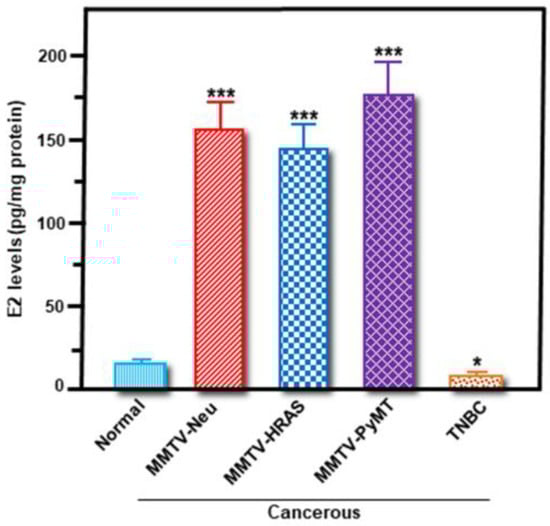 Determination of E2 levels in breast tissues from wild-type mice and four different Tg mouse models of breast tumors. Non-cancerous mammary tissue and cancerous breast tumor tissues collected from wild-type normal, MMTV-Neu, MMTV-HRAS, MMTV-PyMT, and TNBC mice (three different mice in each category) were homogenized in RIPA lysis buffer, and cell lysates from different groups were extracted with dichloromethane as described under Materials and methods. Levels of E2 in extracted breast tissue lysates were determined by ELISA, and presented as pg/mg protein. Data represent the mean ± SE of three different mice in each group. *, p < 0.05; ***, p < 0.001 vs. Normal.