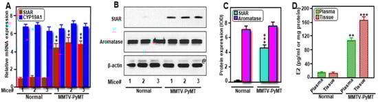 Since breast tumors in MMTV-PyMT Tg mice were identified as ER+/PR+, we determined expression of both StAR and aromatase levels, and their correlation to E2 biosynthesis. As determined by RT-qPCR (Figure 5A), expression of StAR mRNA was 4.6 ± 1.7-fold higher in breast tumors of MMTV-PyMT mice, when compared with normal mouse mammary tissues. CYP19A1 mRNA levels in both MMTV-PyMT-driven breast tumors and normal mammary tissue were substantially high with no apparent differences between the two groups. Whereas expression of the StAR protein was little to none in normal mammary tissue, its level was markedly high (p < 0.001) in breast tumors of MMTV-PyMT mice (Figure 5B,C). In contrast, strikingly higher expression of the aromatase protein (appeared as doublets; []), was similar in these cancerous and non-cancerous breast tissues. E2 levels in plasma and breast tumor tissue extracts were 5.2 ± 2.3 and 9.7 ± 4.6-fold higher, respectively, in MMTV-PyMT mice, when compared these values with respective non-cancerous categories (Figure 5D), reinforcing higher levels of both intra-tumoral and circulating E2 levels in human hormone-sensitive BCs [,]. These findings suggest that aberrant high expression of StAR in breast tumors of MMTV-PyMT mice resulted in abundant delivery of cholesterol to the mitochondrial membrane, facilitating increased availability of androgen precursors for E2 biosynthesis in promoting breast tumorigenesis.