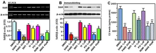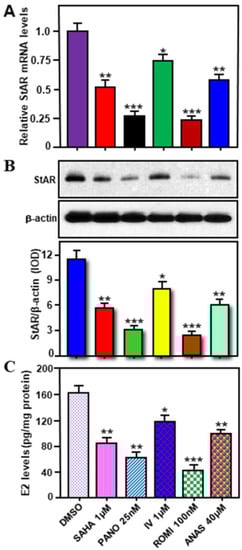 Key reagents such as Panobinostat (LBH589), Entinostat (MS-275), PCI-34051 (A4091), and Anastrozole were purchased from APExBIO (Houston, TX, USA); and SAHA (Vorinostat), Inhibitor IV (Sirtuin 1 inhibitor), and Romidepsin (Istodax, FR228) were purchased from Millipore-Sigma (St. Louis, MO, USA). Different antibodies (Abs) used in the present study were obtained from the following sources: StAR (ab96637 or ab180804 or ab233427; Abcam, Boston, MA, USA), aromatase (ab124776; Abcam), and β-actin (Ambion, Austin, TX, USA).