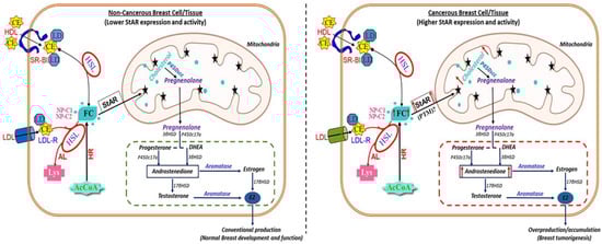 A schematic model illustrating the potential mechanism of StAR-mediated cholesterol utilization in non-cancerous and cancerous breast cells/tissues. Cholesterol used for steroidogenesis derives from a variety of sources. Circulating lipoproteins (high-density lipoprotein, HDL or low-density lipoprotein, LDL) bind to scavenger receptor, class B type 1 (SR-B1) and LDL-receptor, respectively, to release cholesterol esters (CEs) into cells. Hormone-sensitive lipase (HSL) generates free cholesterol (FC) from CEs. FC also arises from de novo synthesis from acetyl-CoA. The conversion of CEs into FC serves as an important step in controlling cholesterol availability for steroidogenesis. The StAR protein regulates steroid biosynthesis by controlling the intra-mitochondrial transport of cholesterol. At the mitochondria, the cytochrome P450scc enzyme converts cholesterol to pregnenolone, which exits the mitochondria and is then converted to various steroid hormones, including androgens and estrogen/E2, by various enzymes. Under physiologic conditions, StAR expression is moderate in breast cell/tissue, supporting appropriate synthesis of E2 for normal breast development and function (left panel). However, in cancerous breast cell/tissue, StAR expression is aberrantly high that presumably facilitates abnormal cholesterol delivery to the inner mitochondrial membrane and, as a consequence, abundant availability of androgen precursors for E2 accumulation in promoting tumorigenesis (right panel). Green and red dotted rectangles illustrate conventional and overproduction of E2 associated with normal breast development/function and breast tumorigenesis, respectively. LDL-R, LDL receptor; AL, acid lipase; Lys, lysosome; HR, HMG-CoA reductase; NP-C1/C2, Niemann-Pick type C1/C2; ↑, increase expression/activity.