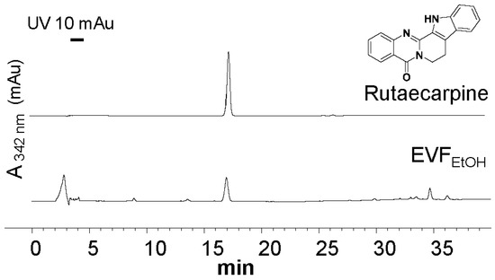 HPLC analysis of the ethanol extract of Evodiae Fructus (EVFEtOH). The characteristic peak of pure rutaecarpine (0.5 mg/mL; upper trace) was found in the EVFEtOH extract (0.1 mg/mL; lower trace) at 10 µL. Absorbance was measured at 342 nm.