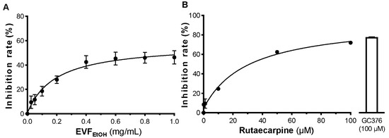 EVFEtOH and rutaecarpine inhibit 3CL protease activity. EVFEtOH (A) and rutaecarpin (B) both inhibited the activity of the enzyme in a dose-dependent manner. GC376 (100 µM) was used as a positive control. The data represent the mean ± SD percentage of inhibition to the control (with no drug treatment), and n = 4.