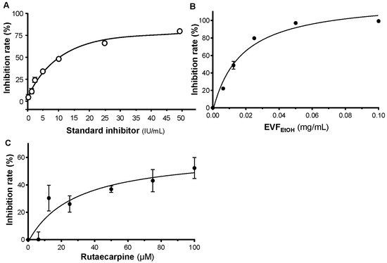 EVFEtOH and rutaecarpine inhibit the binding of S-protein to ACE2. (A) A standard inhibitor (calibrated to NIBSC code 20/136) was utilised as a positive control. EVFEtOH (B) and rutaecarpine (C) both disrupted the binding between the S-protein and the ACE2 receptor. The data represent the mean ± SD percentage of inhibition to control (with no drug treatment), and n = 4.