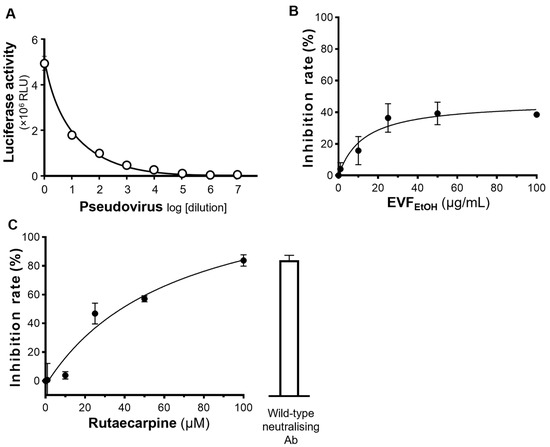 EVFEtOH and rutaecarpine block entry of wild-type pseudovirus into HEK293T cells overexpressing ACE2. (A) The ELISA assay successfully demonstrated the entry of pseudovirus into these cells, exhibiting a dose-dependent response to dilution of the virus. (B) EVFEtOH and (C) rutaecarpine blocked entry of the pseudovirus into the cells in dose-dependent manner. SARS-CoV-2 neutralising antibody was used at 1 µg/mL as a positive control. The values represent the mean ± SD percentage of inhibition to control (with no drug treatment) and n = 3.