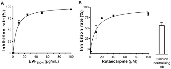 EVFEtOH and rutaecarpine block entry of the omicron pseudovirus into HEK293T cells overexpressing ACE2. (A) EVFEtOH and (B) rutaecarpine both blocked omicron pseudovirus entry in dose-response manners. SARS-CoV-2 neutralising antibody was used at 1 µg/mL, as a positive control. The data represent the mean ± SD percentage of inhibition to control (with no drug treatment) and n = 3.