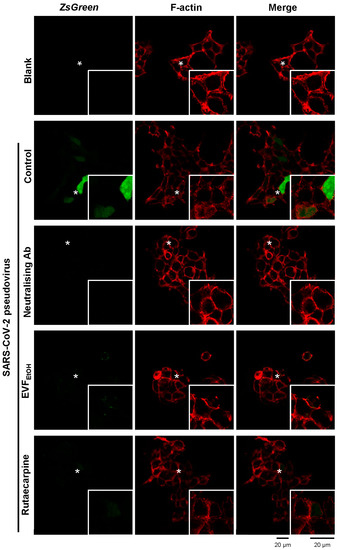 Representative confocal images showing that EVFEtOH and rutaecarpine prevent pseudovirus entry into cultured HEK293T cells. The pseudovirus expressed ZsGreen which generated green fluorescence (color green in the figure) inside cells, and fluorescent phalloidin (color red in the figure) was used to stain the F-actin component of the cell membrane. Prior to exposure to the pseudovirus, cells were either untreated (control) or were treated with a SARS-CoV-2 neutralising antibody (1 µg/mL; positive control), or with EVFEtOH (0.1 mg/mL) or rutaecarpine (100 µM). The fluorescence intensity was significantly decreased following treatment with EVFEtOH or rutaecarpine compared with the untreated controls. In each panel, the region indicated by the asterisk is shown at higher magnification in the inset image. For each treatment n = 3.