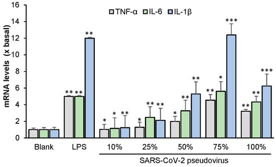 Several lines of evidence indicate that the inflammatory response is a common symptom of COVID-19 among patients [13,14]. TNF-α, IL-6 and IL-1β are recognized as being crucial cytokines in the inflammatory response. Therefore, here we measured the mRNA levels of TNF-α, IL-6 and IL-1β in RAW 264.7 cells infected with wild-type SARS-CoV-2. LPS (used as a positive control) markedly increased the levels of TNF-α, IL-6 and IL-1β relative to the blank (Figure 7). Various concentrations of the virus were then applied, of which a 75% diluted concentration resulted in the highest level of cytokine mRNA. Cell apoptosis was observed at a viral concentration of 100%; as expected, this led to a reduction in the level of each cytokine.