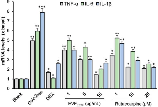 EVFEtOH and rutaecarpine suppress SARS-CoV-2-induced inflammation in cultured macrophages. The mRNA levels of the inflammatory cytokines TNF-α, IL-6, and IL-1β, were measured by RT-PCR. The data indicate the mean ± SD (n = 5) fold change against the blank group (x basal), and the asterisks indicate statistically significant differences such that * p < 0.05, ** p < 0.01, *** p < 0.001 compared with the blank group.