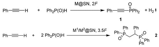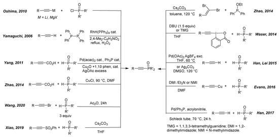- Yang, J.; Chen, T.; Zhou, Y.; Yin, S.; Han, L.-B. Palladium-catalyzed dehydrogenative coupling of terminal alkynes with secondary phosphine oxides. Chem. Commun. 2015, 51, 3549–3551. [Google Scholar] [CrossRef]