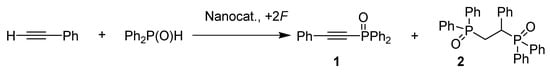 - Khemchyan, L.L.; Ivanova, J.V.; Zalesskiy, S.S.; Ananikov, V.P.; Beletskaya, I.P.; Starikova, Z.A. Unprecedented Control of Selectivity in Nickel-Catalyzed Hydrophosphorylation of Alkynes: Efficient Route to Mono and Bisphosphonates. Adv. Synth. Catal. 2014, 356, 771–780. [Google Scholar] [CrossRef]