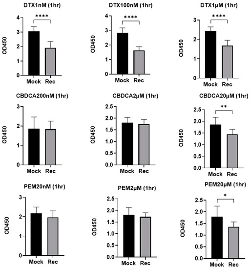 Cytotoxicity caused by several anti-tumor agents toward A549 MOCK and A549 Rec. To estimate the cytotoxic effects of several anti-tumor agents at different concentrations, including decetaxel (DTX; 1 nM, 100 nM and 1 μM), carboplatin (CBDCA; 200 nM, 2 μM and 20 μM), and pemetrexed (PEM; 20 nM, 2 μM and 20 μM) on 2D-cultured A549 MOCK and A549 Rec, the survival of the Cells was evaluated by means of a Cell Counting Kit-8, (Dojindo, Tokyo, Japan) according to the manufacturer’s protocol. Briefly, after culturing 2D cells (5000 cells/well) for 18 h in the absence or presence of each anti-tumor agent, they were incubated with 10 μL of reactive solution for 1 h. The absorbance of each cell at 450 nm was measured using a microplate reader (multimode plate reader EnSpire®, PerkinElmer, Waltham, MA, USA) and plotted (n = 4). Data are expressed as the mean ± the standard error of the mean (SEM). * p < 0.05, ** p < 0.01, **** p < 0.001 (Student’s t-test).