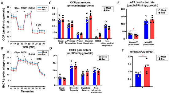 Measurement of mitochondrial and glycolytic functions of A549 MOCK and A549 Rec. The 2D-cultured A549 MOCK and A549 Rec cells were subjected to mitochondrial and glycolytic function analyses using a Seahorse XFe96 analyzer. Measurements of oxygen consumption rate (OCR, panel (A)) and extracellular acidification rate (ECAR, panel (B)) before drug injections (at baseline) and after subsequent supplementation with oligomycin (complex V inhibitor), FCCP (a protonphore), and rotenone/antimycin A (complex I/III inhibitors) and 2-DG (hexokinase inhibitor) are shown. Key parameters in mitochondrial respiration and glycolysis are shown in panel (C,D), respectively. MitoATP production rate and GlycoATP production rate are shown in panel (E). Basal mitoOCR/glycoPER ratio is shown in panel (F). Experiments were performed using fresh preparations (n = 5). Data are presented as the mean ± the standard error of the mean (SEM). * p < 0.05 (Student’s t-test).