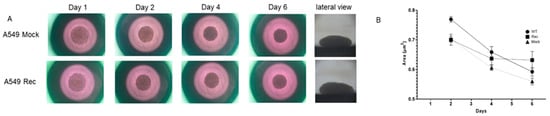 Comparisons of the mean sizes of 3D spheroids of WT, A549 MCOK and A549 Rec. In panel (A), representative phase contrast microscopy images of A549 MOCK and A549 Rec are shown (horizontal views at Day 1, 2, 4 and 6, and lateral views at Day 6, scale bar; 100 μm). The mean sizes of the 3D spheroids of WT, A549 MOCK and A549 Rec were measured at Day 2, Day 4 and Day 6, and plotted in panel (B). Experiments were repeated in triplicate using fresh preparations (n = 10 spheroids each). All data are expressed as the mean ± the standard error of the mean (SEM). Statistical significance was evaluated by ANOVA followed by a Turkey’s multiple comparison test.