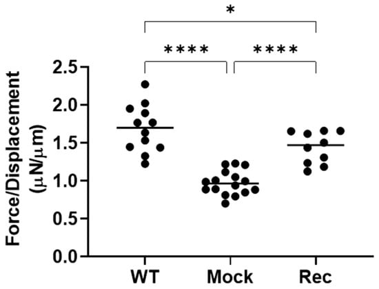 The stiffness of the 3D spheroids of WT, A549 MOCK and A549 Rec were measured at Day 6 using a micro-squeezer, as described in the Methods section. The force (μN) required to compress a single spheroid to the semidiameter (μN/μm) within 20 s are plotted. Experiments were repeated in triplicate using fresh preparations (n = 10 spheroids each). All data are expressed as the mean ± the standard error of the mean (SEM). Statistical significance was evaluated by ANOVA followed by a Turkey’s multiple comparison test (* p < 0.05, **** p < 0.001).