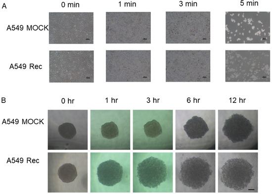 Trypsin digestion of 2D- or 3D-cultured A549 MCOK and A549 Rec. The 2D- or 3D-cultured A549 MOCK and A549 Rec were treated with 0.025% trypsin for 5 min or 12 h, respectively. Representative phase contrast microscopy images of 2D cells and 3D spheroids are shown in panels (A,B), respectively (scale bar; 100 μm). Experiments were repeated in triplicate using fresh preparations (2D; n = 5, 3D; n = 10 spheroids each).