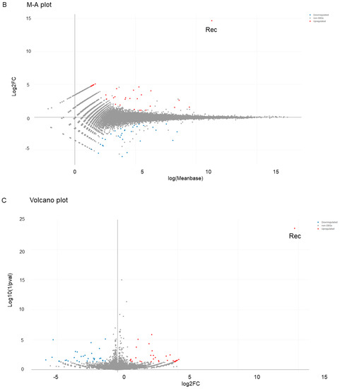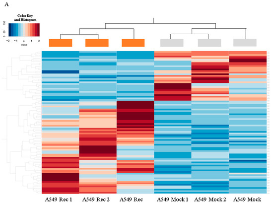 Differently expressed genes (DEGs) between A549 MOCK and A549 Rec cells. In total, 88 genes were expressed differently (fold-change ≥ 2.0 and FDR adjusted p-Value < 0.05 and q < 0.08) between A549 Mock and A549 Rec cells are shown by a hierarchical clustering heatmap (panel (A), A549 Mock; gray, A549 Rec; orange), M–A plots (panel (B)) and volcano plots (panel (C)). M–A plot represents the relationship between the mean expression values [log (baseMean); x-axis] and the magnitude of change in gene expression (log2 of fold-change; y-axis), and volcano plot represents the relationship between the magnitude of gene expression change (log2 of fold-change; x-axis) and statistical significance of this change [−log10 of false discovery rate (FDR); y-axis].