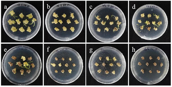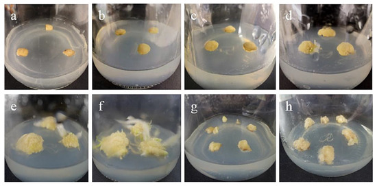 Callus induction from stem axis explants of ‘Siberia’: (a) 0 days after inoculation; (b) 15 days after inoculation, callus began to form; (c,d) callus increased gradually at 20, 30 days; (e,f) after 45 and 60 days of inoculation, a light yellow, compact callus with granular protuberances on the surface gradually formed; (g) the callus just subcultured; (h) the callus of subculture 20 days later.