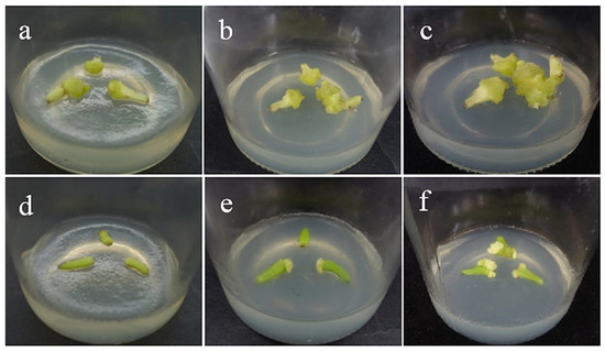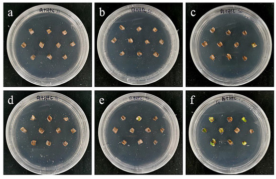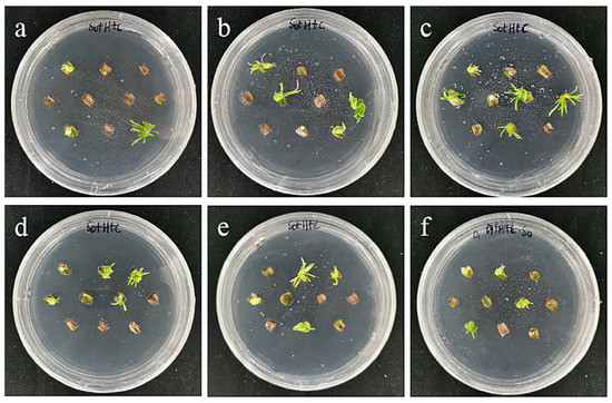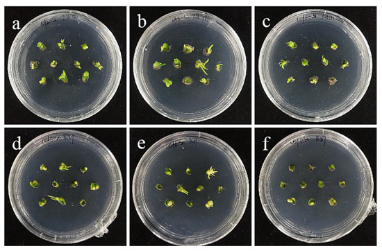 The photos of sterile scales of ‘Sorbonne’ screened for 60 days under different transformation conditions. (a) OD600 = 0.6, 10 min; (b) OD600 = 0.6, 15 min; (c) OD600 = 0.6, 20 min; the results showed that the transformation rate of ‘Sorbonne’ small scales increased with the increase in infection time at the concentration of 0.6 bacterial solution; (d) OD600 = 0.8, 10 min; (e) OD600 = 0.8, 15 min; (f) OD600 = 0.8, 20 min; the results showed that when the concentration of bacterial solution was 0.8, the transformation rate had a downward trend with the extension of the infection time.