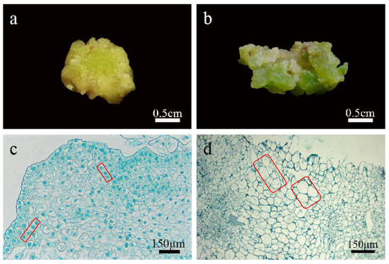 Identification of callus in lily. (a) The embryogenic calli were compact and granular; (b) the non-embryogenic calli were loose; (c) callus cells were small in volume, with large nuclei and easily stained, with few or no vacuoles, and the cell arrangement was relatively regular; (d) non embryogenic calli had a large volume, small nuclei, and were not easily stained, with large vacuoles and irregular cell arrangement.