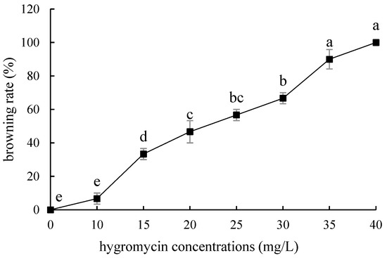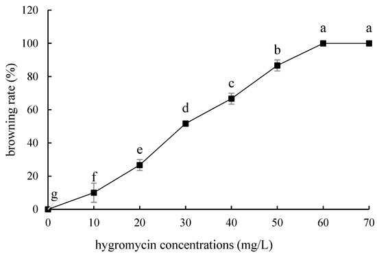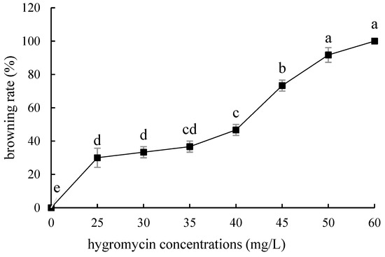 Browning rate of embryogenic callus of ‘Sorbonne’ under different hygromycin concentrations. Note: normal letters in every column indicate significant differences at 0.05 level by Duncan’s multiple range test.