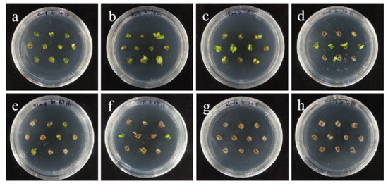 The selection process of hygromycin from sterile scales of ‘Siberia’. (a–h) The photos of embryogenic callus cultured on medium containing 0, 10, 20, 30, 40, 50, 60, and 70 mg/L hygromycin for 40 days. The results showed that in the range of 10–70 mg/L, with the increase in hygromycin concentration, the browning rate became higher and higher and the bud induction rate lower and lower. At 70 mg/L, all small scales were browning and died.