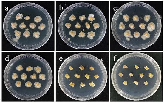 The photos of embryogenic callus of ‘Siberia’ screened for 60 days under different transformation conditions. (a) OD600 = 0.2, 10 min; (b) OD600 = 0.2, 15 min; (c) OD600 = 0.2, 20 min; the results showed that when the concentration of bacterial solution was 0.2, the transformation rate of ‘Siberia’ embryogenic callus increased with the increase in infection time; (d) OD600 = 0.4, 10 min; (e) OD600 = 0.4, 15 min; (f) OD600 = 0.4, 20 min; the results showed that when the concentration of bacterial solution was 0.4, the transformation rate first increased and then decreased with the increase in infection time.