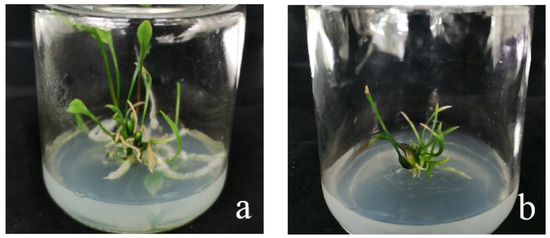 After 15 days of inoculation, the morphological lower end of the filaments began to swell, and only individual explants began to form callus. After 30–35 days, the lower end of ‘Sorbonne’ continued to swell, with obvious callus production (Figure 2a), while ‘Siberia’ started to produce callus at about 45 days, and the callus grew slowly. However, the volume of callus induced by ‘Sorbonne’ filaments was significantly larger than that of ‘Siberia’, so from the comprehensive point of view of the induction rate and the amount of induction, ‘Sorbonne’ was more suitable for using filaments as explants to induce callus.