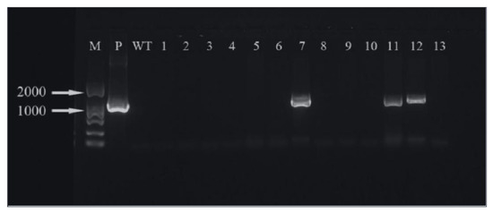 ‘Siberia’ PCR test results. M: marker; P: positive control; WT: non-transformed plants; 1–13: transformed plantlets.
