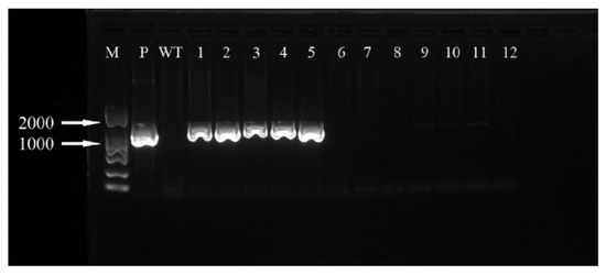 ‘Sorbonne’ PCR test results. M: marker; P: positive control; WT: non-transformed plants; 1–12: transformed plantlets.