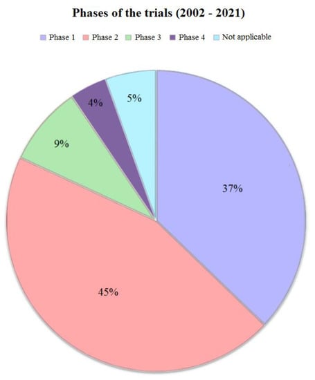 First, the studies were divided according to the phase (Figure 1). Most of the clinical trials were expectedly in phase 1 and phase 2. At the same time, the fourth phase was only 4% of the total sample of studies, and the number of trials in the third phase was only 8%. Upon further dividing the trials into periods from 2002 to 2016 and from 2016 to 2021, no considerable differences were found from the initial overall picture (all studies from 2002 to 2021). The year 2016 was chosen as the boundary in order to obtain the most balanced datasets for comparison.