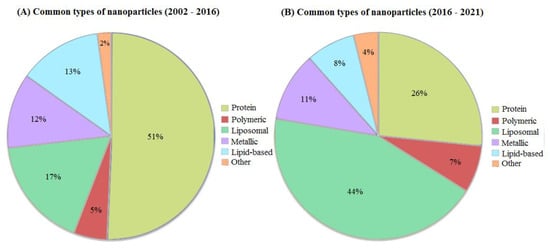Common types of nanoparticles. This figure contains information about the types of nanoparticles used in clinical trials. (A) Pie chart A represents the types of nanoparticles in clinical trials from 2002 to 2016. The group other consists of carbon-based, silica-based nanoparticles and nanostructured formulations of hormones. In the 2002–2016 period, the most abundant type of nanoparticles in clinical trials was protein (51%). Liposomal formulations were the second most common but still relatively low (17%). Lipid-based nanoparticles could be encountered in 13% of all clinical trials in that period. Both metallic and polymeric formulations appeared to be scarce (12 and 5% respectively). (B) This part of the figure represents types of nanoparticles in trials from 2016 to 2021. The group other consists of quantum dots, micellar nanoparticles and exosomes. In comparison to 2002–2016, protein nanoparticles demonstrated a downfall (from 51% to 26%) which can be explained by an increase in liposomal drugs (from 17% to 44%). Lipid-based formulations also faced a slight decrease to 8%, while metallic and polymeric drug percentages stayed almost the same (11% and 7%, respectively).