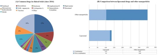 Common drugs and liposomal drugs application. The categories in (A) were formed based on the most common studied drugs. Mostly, each drug was mentioned individually except for the groups metals, vaccine and other. The first two groups were formed based on the heterogeneity of the drugs they comprise. The vaccine group most often consisted of mRNA vaccines, while the Metals group was dominated by various iron preparations. Others consisted of drugs that occurred no more than two times in the entire excerpt. Paclitaxel consisted of various nanoparticle types that were loaded with paclitaxel. Among them, NAB-paclitaxel was occurring the most often (57 trials out of 62 trials for paclitaxel in total). Chemotherapy drugs in general were the most common drugs in the dataset (paclitaxel—23%, doxorubicin—9%, irinotecan—7%). Different vaccines and metals were also often mentioned in clinical trials (8% and 11% respectively). Local anesthetic bupivacaine was also frequently incorporated in nanoparticle systems (8%). Obtained results could be explained by various properties that nanoparticles can have as drug carriers (for instance, site-specific drug delivery). (B) shows the division of clinical trials that studied liposomal drugs either individually or in combination with other regular drugs. Based on (B), liposomal drugs were primarily used in combination with other drugs (125 clinical trials with combinations out of a total of 135 liposomal trials). Such a phenomenon can be explained by a small amount of liposomal clinical trials in comparison with all the other types of nanoparticles. The second possible reason can be due to specific diseases (for instance, neoplasms) that require a combination of therapeutic agents and prevail in our dataset. mRNA—messenger ribonucleic acid, NAB—nanoparticle albumin-bound.