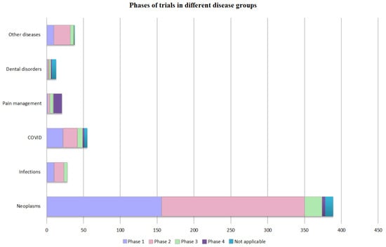 The studies were also divided according to the indications. The following groups of diseases were identified: dental disorders, neoplasms, pain management, infections, COVID and other diseases that included various neurological, cardiovascular or rare genetic disorders. Further, within each of the groups of diseases, the studies were divided according to the phase in which they were. These results are presented in Figure 4.