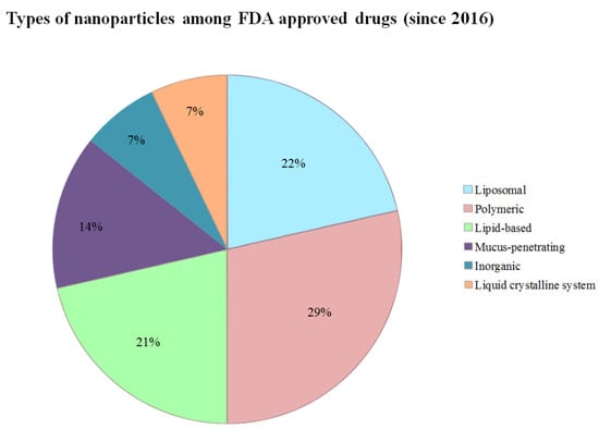 The most prevalent categories of FDA-approved drugs since 2016 were polymeric (29%), liposomal (22%) and lipid-based (21%). Liposomal drugs were also occupying 44% of all drug types in investigational drugs in the period from 2016 to 2021. However, polymeric nanoparticles only stand for 7% of investigational drugs (Figure 2). Polymeric nanoparticles are a promising approach in vaccine and antibiotics delivery as well as cancer therapy due to their favorable characteristics that comprise wide structure variety and also comparatively uncomplicated elaboration and design. Several polymeric nanoparticles tend to show better results when compared with regular administration [23]. Considering that liposomal nanoparticles are sometimes grouped with all other lipid-based formulations, the overall percentage among FDA-approved nanoparticle drugs would be 43% (Figure 5). Therefore, lipid-based nanoparticles (especially, liposomal) appeared to be the most common applied drugs in both clinical trials and FDA-approved drugs since 2016 according to our data (52% of lipid-based substances in clinical trials and 43% among FDA-approved drugs). The predominance of liposomes among lipid nanoparticles is also indicated in some of the recent reviews [52,53,54]. Liposomes have shown remarkable results due to their high bioavailability and relatively low immunogenicity [55]. However, some authors also note the existing gap between the number of clinical lipid formulations and those that have reached the market, which might explain a small amount of FDA-approved lipid formulations (six drugs, Table 1) [28].