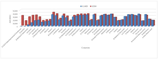 PM analysis for the utilization of carbon sources by L. lactis strains IL594 and IL1403. The height of the bars indicates the value of the area under the curve (AUC) of metabolic activity of the strains on a given C-source. Bars shown refer only to carbon sources for which metabolic activity of at least one strain was detected and the colorimetric reaction kinetics plot had an AUC value > 15,000 in Omnilog Arbitrary Units (OAU).