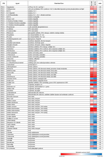 Metabolic activity coefficients were also generally slightly elevated for most other compounds in IL594 compared to IL1403. This was especially true for several chelators (e.g., EGTA and 5,7-dichloro-8-hydroxy-quinaldine), although most were lethal to both strains. IL594 was also more resistant to an NDGA lignan (nordihydroguaiaretic acid) and a variety of chemical compounds, including inhibitors of thymine and methionine synthesis (hydroxyurea), selected alkaloid derivatives (chelerythrine) and sodium azide (Figure 2).