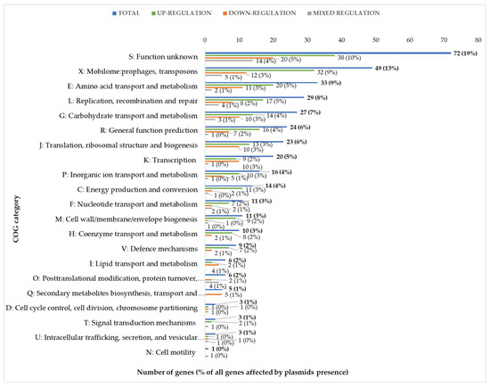 The effect of plasmids presence also affected the expression of regulatory genes and resulted in significant variation in the expression of 20 genes listed in the COG category K. Plasmid-induced activation as much as repression of genes encoding transcriptional regulators was observed in this group. Among them, a bunch of genes encoding hypothetical regulators of the TerR/AcrR family (ybeD, ycfA, yohC and ygfC) or GntR family (rgrA) was strongly inhibited, as well as regulatory genes with defined function such as mleR and rbsR encoding, respectively, malolactic fermentation activator and the repressor of the ribose metabolism operon. On the other hand, the activation of expression was observed for the pyrR gene encoding the pyrimidine biosynthesis regulatory protein as well as several genes with putative regulatory function (e.g., ynaB, rliB, rmaE, yjaJH) belonging to different families such as LacI, MarR, or LytR.