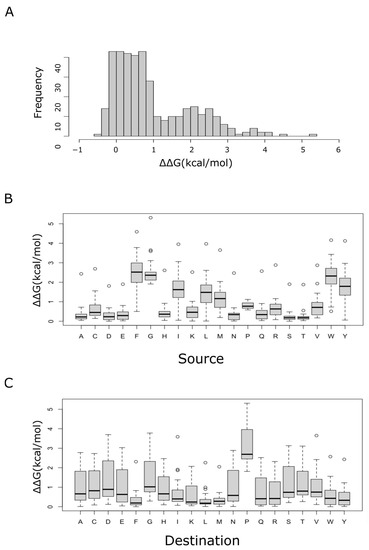 The matrix shown in Table 1 is an asymmetric one. This asymmetry becomes evident in a very visual way when Figure 1B,C are compared. For instance, phenylalanine was a good replacement for other amino acids (little destabilizing when a destination), but it was the least readily replaced (highly destabilizing when a source). On the other hand, although proline was revealed as an amino acid always involved in radical substitutions, those changes where proline was the replacement for other residues tended to be much more destabilizing than when proline was the substituted residue. In general, Ser, Thr, Asp, Glu and Ala were amino acids most often involved in conservative substitutions when acting as sources, while those most often involved in radical substitutions were Gly, Phe, Trp, Tyr, Ile, Leu and Met. Regarding the conservative/radical nature of substitutions when focusing on the replacing (destination) amino acid, Met, Leu and Phe tended to be good replacements for most residues (conservative), while Ser, Thr, Asp, Gly and Pro were among the most radical substitutions when acting as destinations. Although these observations may point to true evolutionary trends, they must be treated with caution, since FoldX, as well as other programs based on energy functions, may sometimes overestimate the stability of hydrophobic residues, which then may appear, unrealistically, as intrinsically more stable than polar amino acids [17].