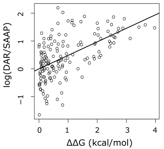 Data collected in Table 1 represent a statistical summary of the effect of amino acid substitution on protein stability, for each of the 380 possible amino acid replacements averaged across the entire human proteome. Thus, we next took advantage of this statistical information to address the relative relevance of protein structure destabilization as the cause of diseases linked to missense mutations in humans. To this end, for each source–destination amino acid substitution we computed its disease-causing potential, defined as the number of such substitutions reported to cause disease. The disease-associated amino acid residues (DARs) [18] were divided by the number of the same source–destination substitutions observed among a collection of single amino acid polymorphisms (SAAPs) common in humans (allele frequencies above 0.01), and thought to be mostly neutral [19,20]. As observed in Figure 2, there was a very significant (p-value = 1.7 × 10−14) positive correlation between the values that we computed and the log of the disease-causing potential of amino acid substitutions. Thus, explained over 32 % of the variance in the log(DAR/SAAP).