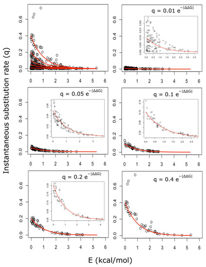 Work carried out over the last decade has shown, in the context of protein evolution, the usefulness of introducing the perspective of thermodynamic stability [31,32,33,34]. However, none of these studies addressed the effect of mutations on protein stability at a proteomic scale. Thus, to what extent stability shapes protein evolution and determines the observed amino acid substitution rates, remains an open question [9]. Since global substitution matrices are constructed by averaging rate values observed over numerous sites in many proteins, unraveling the relationship between these rates and changes in stability must require averaging ∆∆G across many sites in many proteins as well. In a promising recent work, Norn and coworkers, using the Rosetta modeling suite, addressed the thermodynamic effect (∆∆G) of all the possible amino acid mutations in 52 protein structures [11]. Herein, using super-computational resources and taking advantage of the AlphaFold project [35,36], we assessed the changes in stability (∆∆G) for all possible mutations at all sites in 14,094 different human proteins. To the best of our knowledge, this is the first work to report on site-specific changes in stability on an entire proteome (Table S1). In order to use all this wealth of data in a model that may provide insights on the relative importance of stability constraints, site-specific ∆∆G values were averaged over sites and proteins (Table 1). The significant positive correlation observed between the median ∆∆G and the disease-causing potential (Figure 2), indicated that these ∆∆G values acceptably summarized the effect of the considered substitutions on protein stability, and reinforced the idea that mutations leading to extreme values of ∆∆G are preferential targets of purifying selection. In this way, ∆∆G can be envisioned as an energy barrier that opposes the fixation of the considered mutation. This view is reminiscent of a well-known kinetic function, namely, the Arrhenius law (see Equation (5)). Indeed, the values of the Q matrices are instantaneous rates, making the proposed kinetic analogy appropriate. Nevertheless, it should be pointed out that we are not claiming that the amino acid substitution rates behave according to the kinetic theory of collisions. That is, the Arrhenius analogy we present herein is just that, an analogy. In any case, this analogy can be useful, as we discuss shortly, in dissecting the relative contribution of mutational rates and purifying selection. However, a brief consideration of the Arrhenius law is necessary.