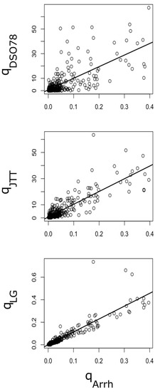 Relationship between empirical amino acid substitution matrices and the Arrhenius kinetic model. The instantaneous substitution rate values, corresponding to the QDSO78, QJTT and QLG matrices, have been plotted against the matrix computed according to the Arrhenius model. The correlation coefficients are given in Table 2, and the p-values were less than 2.2 × 10−16 in the three cases. The R2 values were 0.510, 0.730 and 0.823, respectively.