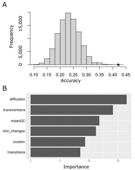 Performance of the predictors related to the genetic code employing a random forest classifier. (A) Null distribution for the accuracy. To build this distribution a random classifier acted on 100,000 samples with the same size and data strata as the testing set. The filled black circle points to the accuracy for the random forest classifier on the testing set. (B) Variable importance plot for the random forest classifier. The method used to compute variable importance was the mean decrease in node impurity (Gini importance).