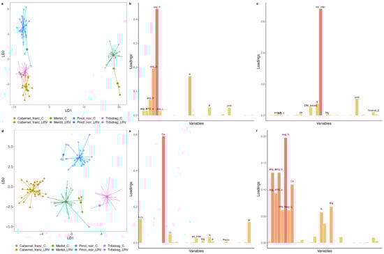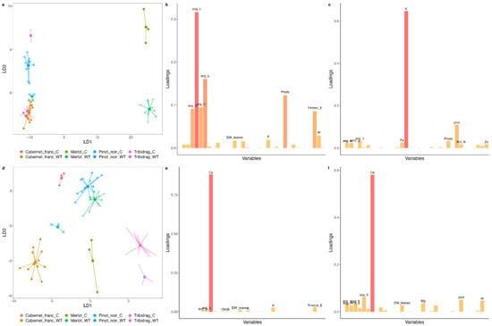 DAPC analysis for grapevines infected with WT isolates showed less separation in the first year only for ‘Cabernet Franc’ (Figure 5a). In addition, WT-infected plants of the ‘Tribidrag’ variety were also grouped with ‘Cabernet Franc’ plants. LD1 separated ‘Merlot’ from other varieties showing the highest loading for a set of colorimetric parameters (chroma value; avg c), but also parameters involved in photosynthesis to some minor extent. LD2 separated controls from WT-treated plants for all but ‘Cabernet Franc’ and showed the highest loading for K. Similarly, as for LR treatment, we observed a better separation of varieties and treatment in the second year with Ca as the determining factor in both LDs. The spread of plants inoculated with different WT again did not change from year to year.