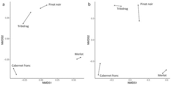 ‘Merlot’ was again the variety with the smallest change between the years (Figure 2b). In contrast to LR, the ‘Tribidrag’ variety showed less change, and ‘Pinot Noir’ showed more change between the years.