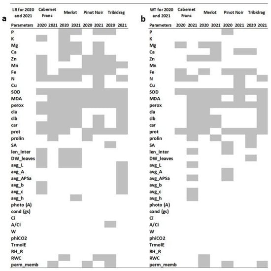 Summary of changed parameters according to ANOVA analyzed for leafroll (LR) genotypes in 2020 and 2021 (a) and wild-type (WT) genotypes in 2020 and 2021 (b) for every grapevine variety. Statistically significant (p < 0.05) differences are signed in grey.
