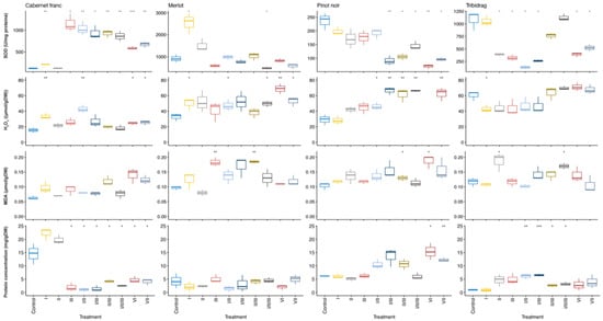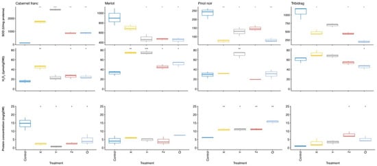 Differences in superoxide dismutase (SOD), hydrogen peroxide (H2O2), and proteins caused by wild-type (WT) genotypes in 2021 in relation to control plants in ‘Cabernet Franc,’ ‘Merlot,’ ‘Pinot Noir’ and ‘Tribidrag’ grapevine varieties as analyzed by t-test. Significant differences are indicated with asterisks as follows: ‘*’indicates p < 0.05, ‘**’ indicates p < 0.01 and ‘***’ indicates p < 0.001.