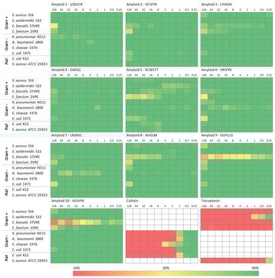 In the final stage of our research, we verified the antimicrobial properties of ten short amyloids. We used ten bacterial strains, five Gram-positive and five Gram-negative, including eight clinical strains and two reference strains—100 combinations of peptides and bacteria in total (Figure 1, Table S3). As controls, we used colistin [54,55] and teicoplanin [56,57]. They have been used to treat multidrug-resistant infections, Gram-negative and Gram-positive, respectively. Both controls were proven to be very effective in destroying the tested bacteria; their MIC values, i.e., the minimum inhibitory concentration that inhibits visible growth (kills more than 90% of the inoculum within 18–24 h), ranged from 0.25 to 8 µg/mL, depending on the strain and antibiotic used (Figure 1).