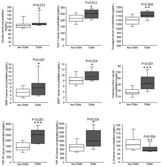 Compared to obese nonT2DM individuals, in obese class III (OBIII) patients, T2DM induced higher serum levels of the following 7 proteins, which are all involved in glucose metabolism, satiety and inflammation (Figure 1): ghrelin, glucagon like-peptide-1 (GLP-1), glucagon, B-cell activating factor (BAFF), chitinase 3-like, tumor necrosis factor receptor 1 (TNF-R1) and tumor necrosis factor receptor 2 (TNF-R2) and matrix metalloproteinase-3 (MMP-3). In contrast, the pro-inflammatory cytokine interleukin-8 (IL-8) showed significantly lower levels in obese T2DM versus obese nonT2DM.
